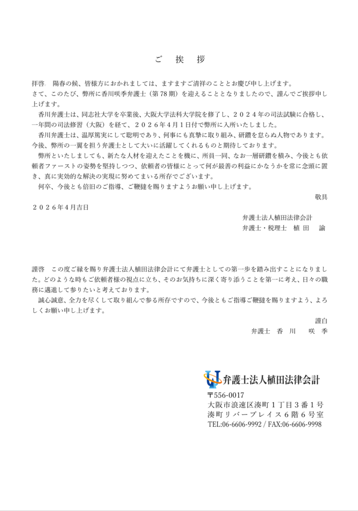 2026年4月1日付で弁護士法人植田法律会計に新たに香川咲季弁護士を迎えました。